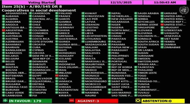 La resolución de la ONU fue aprobada por una abrumadora mayoría de 179 votos a favor y 3 en contra, pese que en los tres países que lo hicieron en sentido contrario existe una rica historia de desarrollo económico a través de una fecunda tarea comunitaria y social que en silencio realizan los distintos tipos de cooperativas existentes (de vivienda, salud, trabajo, energía eléctrica, etc.), es decir, que todas ellas cumplen un rol muy importante en la economía real.