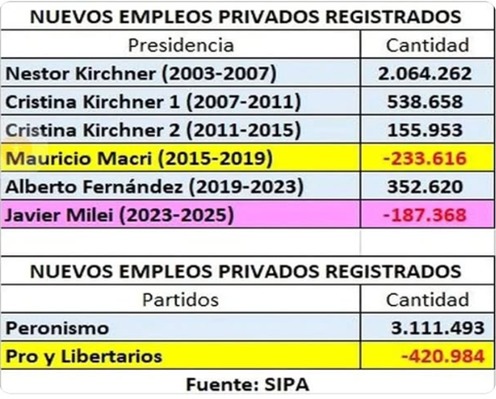 Como hemos podido apreciar durante el menemismo, el macrismo y ahora con los libertarios, la realidad nos ha demostrado que estos preconceptos solo intentan esconder que la torta de distribución cuando acceden al gobierno los neoliberales o anarco-capitalistas como se define Milei, lejos de promover el empleo y formalizar puestos de trabajo a la fecha informales, lo que hacen es expulsar del mercado laboral a miles y miles de trabajadores, así lo confirma el cuadro elaborado por el SIPA que refleja acabadamente como aumenta la demanda laboral en el sector privado durante los gobiernos populares y como decrece con los gobiernos que no protegen la soberanía, el trabajo y la dignidad de sus pueblos.