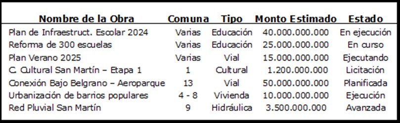 Entre las intervenciones más destacadas se encuentra la restauración integral del Centro Cultural San Martín, además de la modernización de bibliotecas y centros vecinales. El plan cultural promueve además intervenciones artísticas urbanas y nuevos espacios de participación ciudadana.
